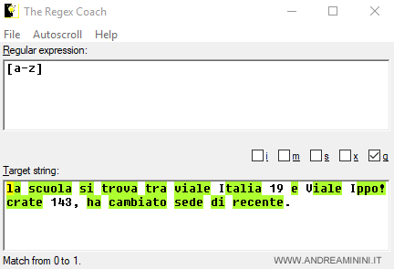 Nota. Se avessi dovuto indicare espressamente tutti i caratteri ammessi, avrei dovuto scrivere [abcdefghijklmnopqrstuvwxyz]. Lo stesso risultato lo ottengo con la forma contratta [a-z].