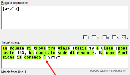 Importante. L'accento circonflesso ^ funziona soltanto quando si trova alla prima posizione dopo l'apertura della parentesi quadra. Se si trova in un'altra posizione ( seconda, terza, ecc. ) viene considerato come un carattere qualsiasi. Ad esempio, la regex [a-z^b] non esclude il carattere b dalla selezione a-z, bensì aggiunge il carattere ^ al matching.