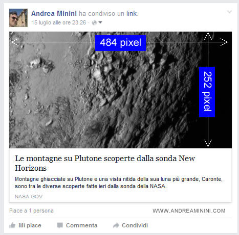 Nel caso dei link condivisi su Facebook, le dimensioni migliori della foto di anteprima sono 484x252 pixel.