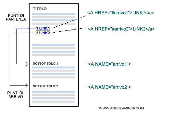 - Un punto di arrivo. Si tratta di un ancora da inserire nel punto di destinazione. E' la zona della pagina dove il browser si deve spostare quando l'utente clicca sul collegamento interno. E' detta ancora o ancoraggio.