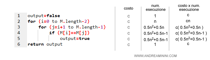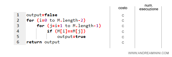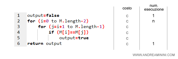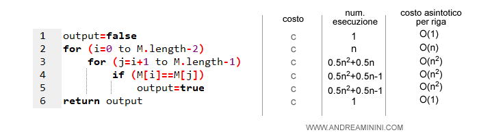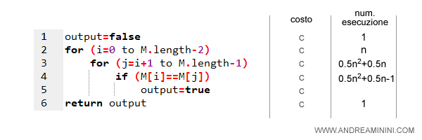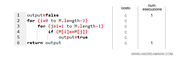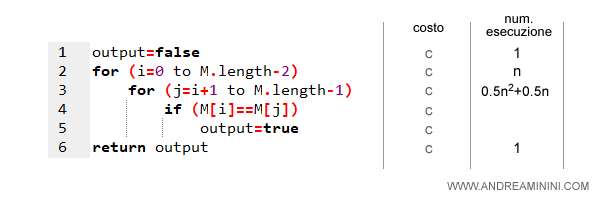 Infine, la linea 5 viene eseguita ogni volta che M[i]=M[j] è soddisfatta (linea 4).