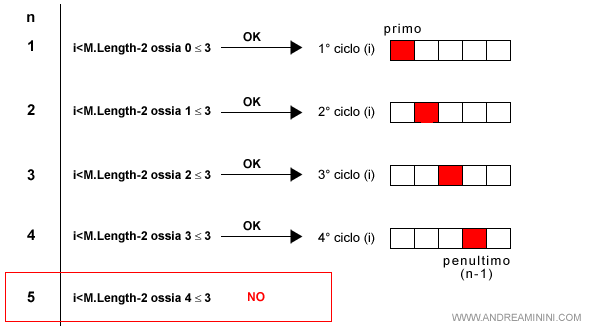 La seconda linea del codice è un'iterazione for che va dal primo elemento del vettore (i=0) al penultimo (i=length-2) ossia 5-2=3 ( incluso ).
