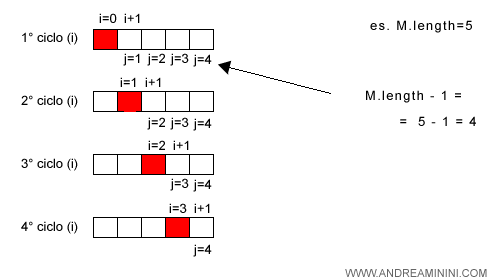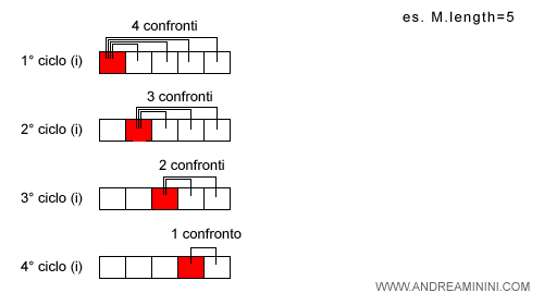 Nota. Il ciclo più esterno non analizza l'ultimo elemento perché non ha alcun elemento successivo. Quindi, il ciclo va dal primo al penultimo elemento. Il ciclo più interno, invece, prende in considerazione soltanto gli elementi successivi a quello di riferimento (i) per evitare di ripetere gli stessi confronti più volte.