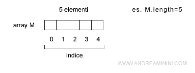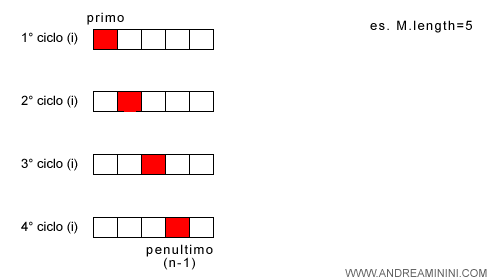 Attenzione. Come nel precedente caso n-1 indica l'ultimo elemento dell'array. L'array è composto da 5 elementi (n=5) ma il primo elemento parte dalla posizione zero (M[0]). Pertanto l'ultimo elemento è M[4] ossia n-1=4.