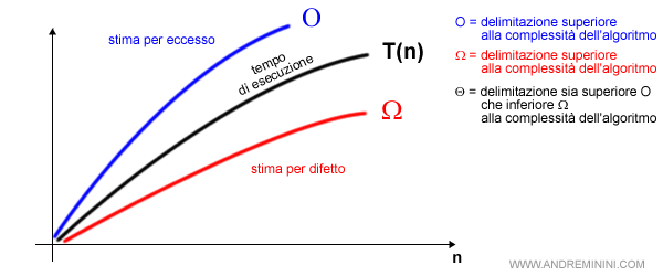 Nota. Oltre a O grande si utilizzano anche le altre notazioni del calcolo asintotico, ossia omega (Ω) e theta (θ). In questo appunto mi limito ad accennare la loro esistenza per non appesantire la spiegazione. La differenza tra O, Ω e θ è la delimitazione superiore, inferiore o media della funzione T(n). Per approfondire la differenza rimando alla lettura del calcolo asintotico.