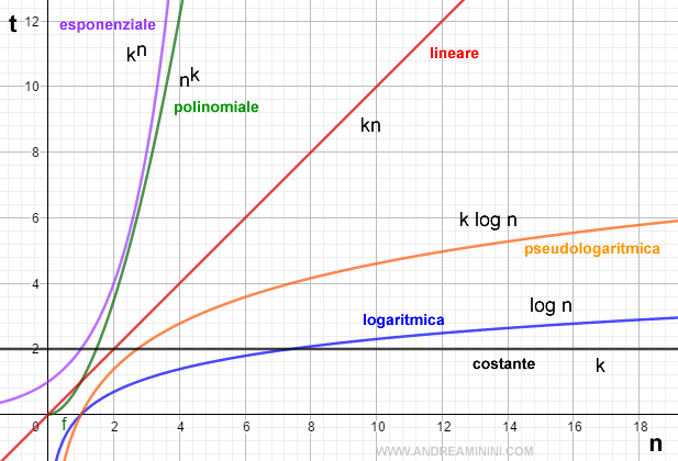 Per rendere più chiaro il concetto, in questo grafico mostro come cambia il tempo di esecuzione (t) dell'algoritmo all'aumentare del numero dei dati (n) nelle varie complessità.