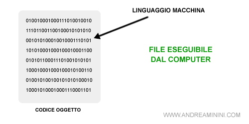Cos'è l'oggetto? E' un elenco di operazioni, scritte dal software compilatore in linguaggio macchina in un file eseguibile ( es. EXE ). Si chiama "eseguibile" perché il file può essere eseguito direttamente dal computer. Essendo scritte in linguaggio macchina, le istruzioni nel codice oggetto non sono comprensibili agli occhi di un utente e del programmatore stesso.