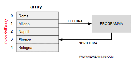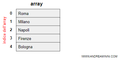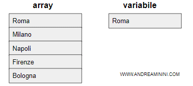 Nota. Nell'esempio precedente ho assegnato alla variabile soltanto il valore alfanumerico "Roma". All'array ho invece assegnato più valori alfanumerici "Roma", "Milano", "Napoli", "Firenze", "Bologna".