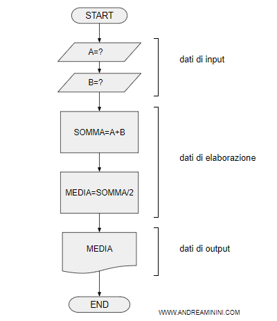 - Dati di elaborazione. Sono i dati temporanei creati durante l'esecuzione del programma. Non sono dati né di input, né di output. Ad esempio, nell'algoritmo precedente la variabile somma è un dato temporaneo.