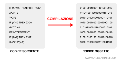 Nota. La compilazione del codice sorgente è necessaria soltanto sui linguaggi compilati ( es. il linguaggio C ). Nel caso dei linguaggi interpretati ( es. python, php, ecc. ) il codice sorgente è eseguito dal computer senza compilazione, tramite un apposito software interprete installato sulla macchina.