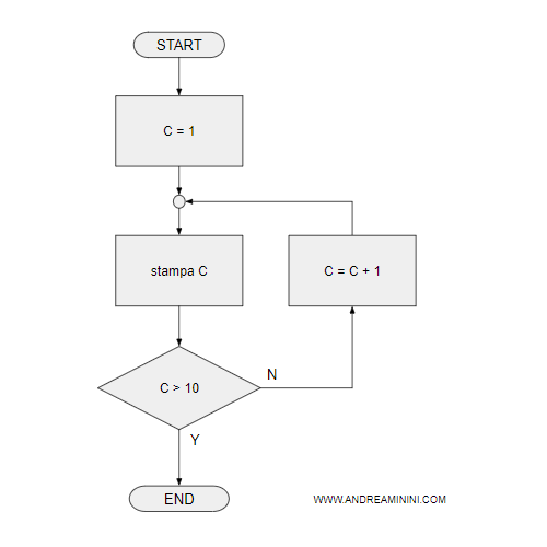 - Se C è minore di 10. La struttura di controllo aumenta di uno il valore della variabile ( C=C+1 ) e torna indietro con un feed-back per cominciare una nuova iterazione.