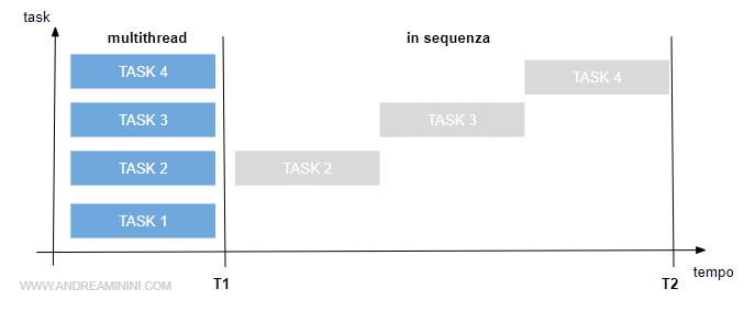 Esempio. Nell'esempio precedente il tempo di esecuzione del programma in multithreading è T1. Se il programma eseguisse i task in sequenza il tempo di esecuzione sarebbe T2. Circa quattro volte superiore.