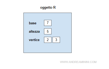 Quando istanzio un oggetto alla classe, ad esempio l'oggetto R, definisco i valori delle variabili base, altezza e vertice.