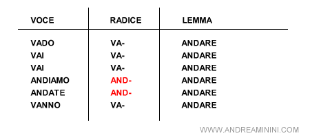 La differenza tra lemma e radice. Un lemma è composto da tema+desinenza. La radice è una parte del tema. Non necessariamente lemma e tema coincidono. Ad esempio, la radice del verbo andare è and- che include alcune voci verbali ( andiamo, andate ) ma ne esclude altre ( vado, vai, va, vanno ). Il lemma ( andare ) le comprende tutte.