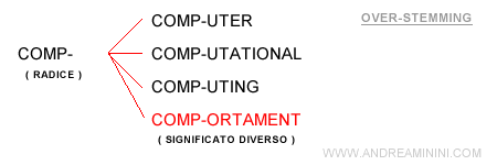 Over-stemming. Si individuano più legami tra le parole con lo stesso significato ma si rischia di includere anche quelle con significato diverso. Lo svantaggio è la perdita di specificità.