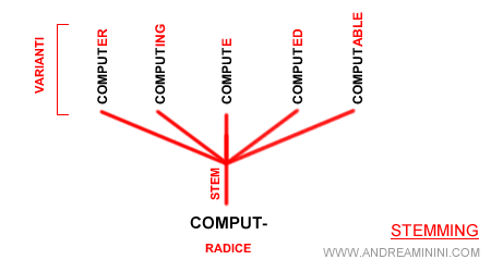 Nello stemming la radice è un elemento linguistico irriducibile della parola che continua a esprimere il significato del termine completo.