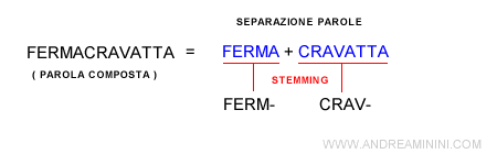 Soluzione. Una possibile soluzione del problema consiste nel suddividere la parola composta nei due termini che la compongono e trovare per ciascuno di essi la relativa radice.