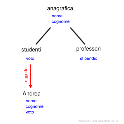 Pertanto, l'oggetto Andrea eredita sia gli attributi/metodi della classe studenti, sia quelli della superclasse anagrafica.