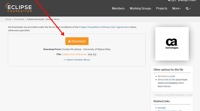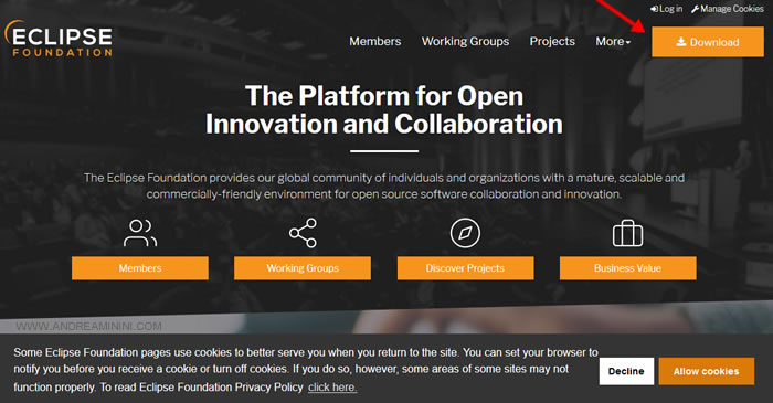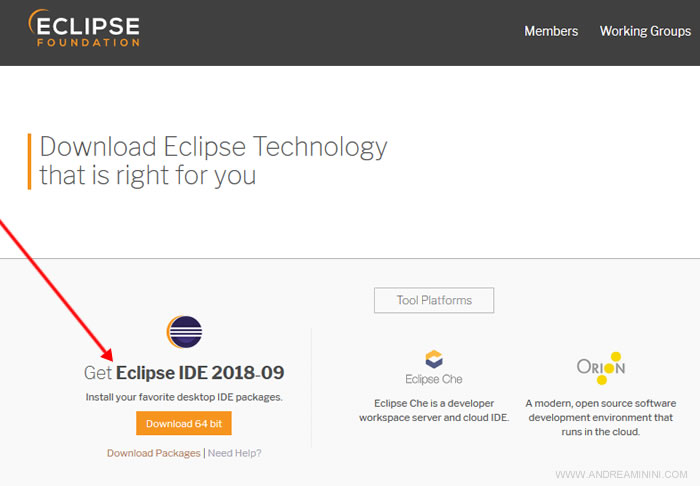 Per installare la piattaforma Eclipse vado sul sito ufficiale di Eclipse.