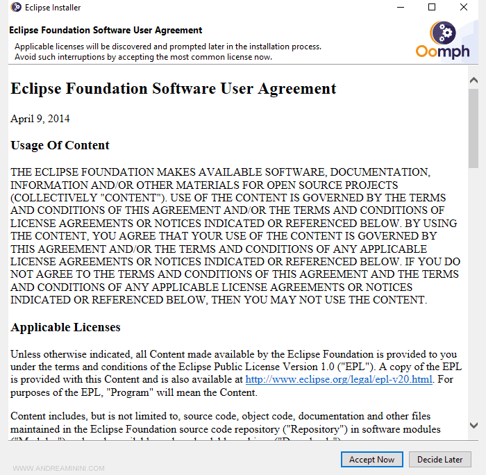 Ora l'installer mostra le condizioni di utilizzo di Eclipse.