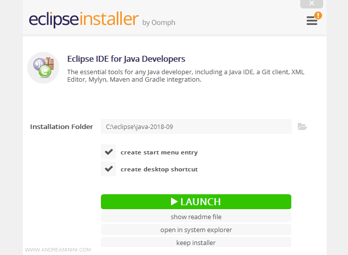 In questo caso seleziono Eclipse IDE for Java Developers per avere i tool essenziali di sviluppo nel linguaggio Java.