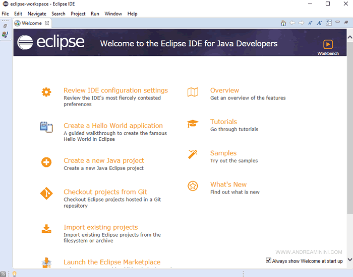 Si apre la schermata iniziale dell'ambiente di lavoro Eclipse.