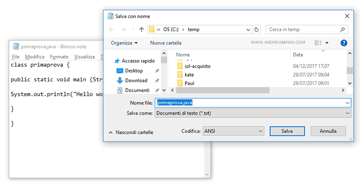 Poi salvo sul computer il codice sorgente in un file di testo dandogli il nome primaprova.java.