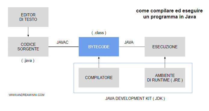 Nota. Un programma Java può essere eseguito soltanto in un ambiente JRE. Quindi, se non è stato installato l'ambiente di sviluppo JRE sul PC, il bytecode non può essere eseguito. In genere l'ambiente JRE è incluso nel compilatore Java. Può comunque essere installato anche separatamente dal compilatore.