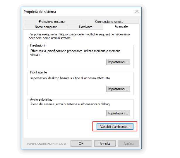 Nella finestra successiva apro la scheda Avanzate e clicco sul pulsante Variabili d'ambiente.