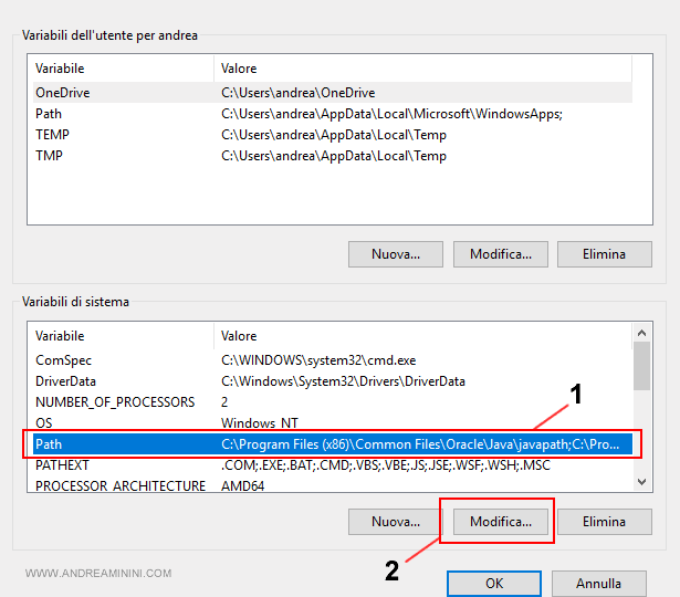 Poi seleziono la voce PATH nella sezione delle variabili di sistema e clicco sul pulsante Modifica in basso.