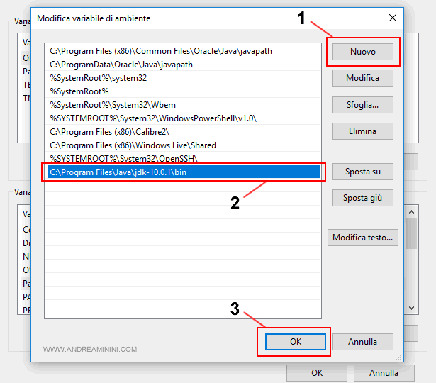 Per aggiungere il nuovo percorso clicco sul pulsante Nuovo a destra, poi aggiungo la directory dove si trova javac,nel mio caso è C:\Program Files\Java\jdk-10.0.1\bin. Per registrare la modifica clicco sul pulsante OK in basso a destra.