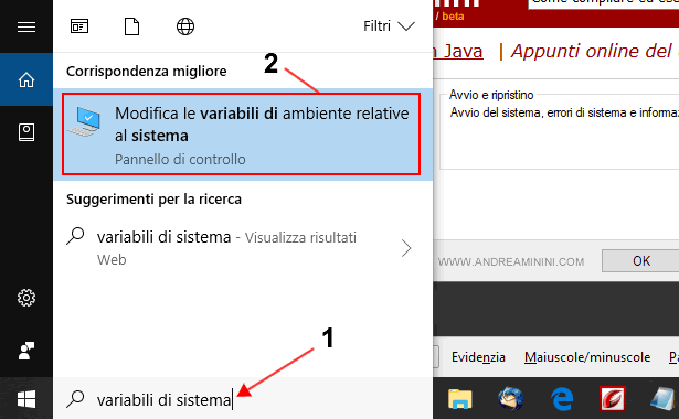 Se non è presente, per aggiungerla cerco "variabili di sistema" nel campo di ricerca di Windows 10 e clicco sulla voce Modifica le variabili di ambiente relative al sistema. Nelle versioni precedenti di Microsoft Windows ( 7, Vista, XP ) questa voce si trova nel Pannello di controllo.