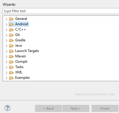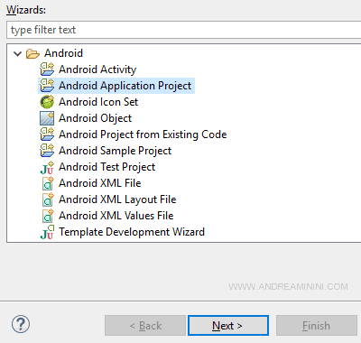 Nota. In alcuni casi la voce Android Application Project viene visualizzata nelle prime voci del menu. In questi casi basta selezionarla.