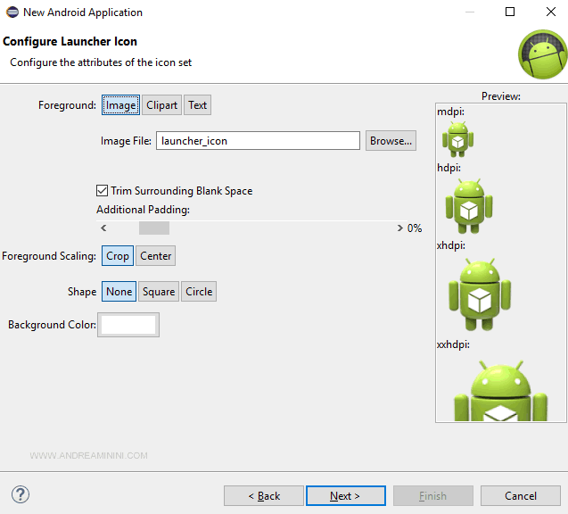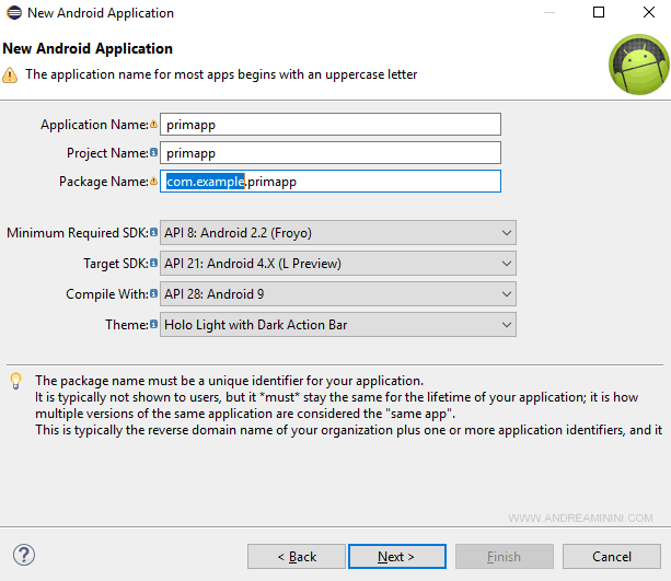 Nota. Pur non essendo visibile agli utenti, il nome del pacchetto è molto importante perché deve essere un identificativo unico dell'applicazione. Il nome dell'applicazione è invece il nome visibile agli utenti che scaricano l'app su Playstore.