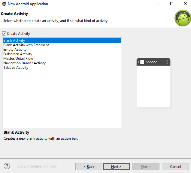 Seleziono Blank Activity o Empty Activity per creare un'activity bianca o vuota.