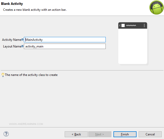 Digito il nome dell'activity e del layout.