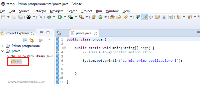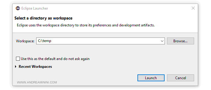 Per iniziare a programmare in Java, all'apertura di Eclipse devo indicare una cartella del PC da usare come area di lavoro ( workspace ).