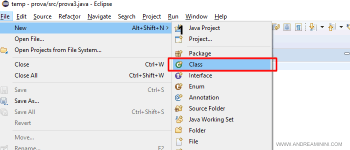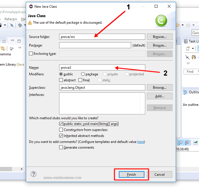 Nella schermata seguente indico la cartella dove salvare la classe ( Source Folder ) e il nome della classe ( Name ).
