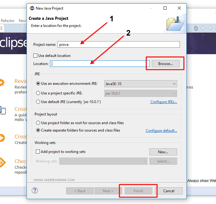 Ora scrivo il nome del progetto e indico la cartella del PC da usare per salvare i files del progetto.