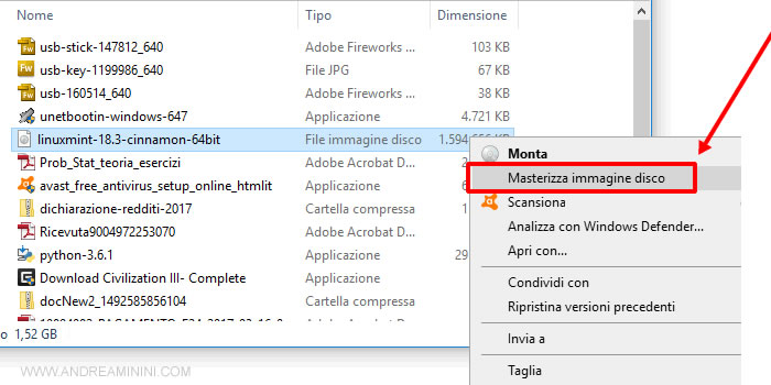 Quindi clicco con il tasto destro del mouse sopra il nome del file ISO appena scaricato.