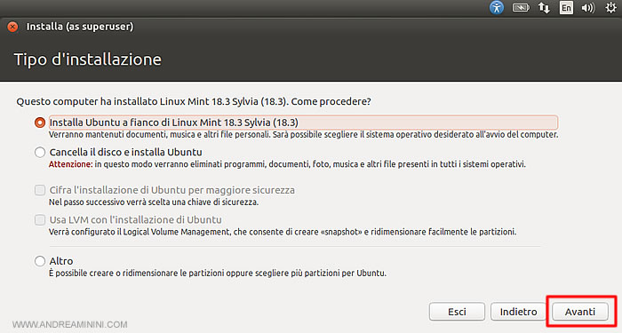 In una schermata Linux chiede se voglio installare Linux come unico sistema operativo del PC o a fianco al sistema operativo già esistente ( es. Windows, Mac o altra distribuzione di Linux ).