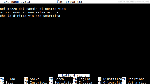 Nota. Sulla parte in basso sono elencati i comandi dell'editor nano. Il simbolo dell'accento circonflesso ^ rappresenta il tasto CTRL della tastiera, seguito da una lettera. Ad esempio ^T controlla l'ortografia, ^K taglia un contenuto, ^U incolla il contenuto, ^J giustifica il testo, ecc. E' anche disponibile una guida all'utilizzo di nano tramite ^G.