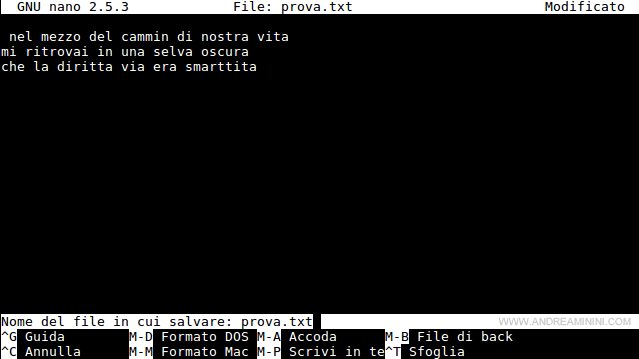 Poi digito il comando nano seguito dal nome del nuovo file (non ancora esistente).
