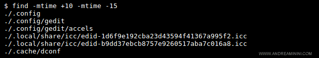 - -mtime. Seleziona i risultati in base al tempo. Ad esempio, quelli modificati da almeno 10 giorni ( -mtime +10 ) e non oltre 15 giorni ( -mtime -15 ).