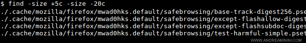 - -size. Seleziona i risultati in base alla dimensione dei files. Ad esempio per cercare i file con dimensione compresa tra un byte ( -size +1c ) e inferiori a 10 byte ( -size -10c ).