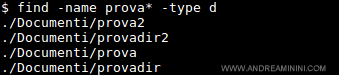 - -type. Seleziona i risultati in base alla tipologia. Ad esempio, le directory (d), i files (f).