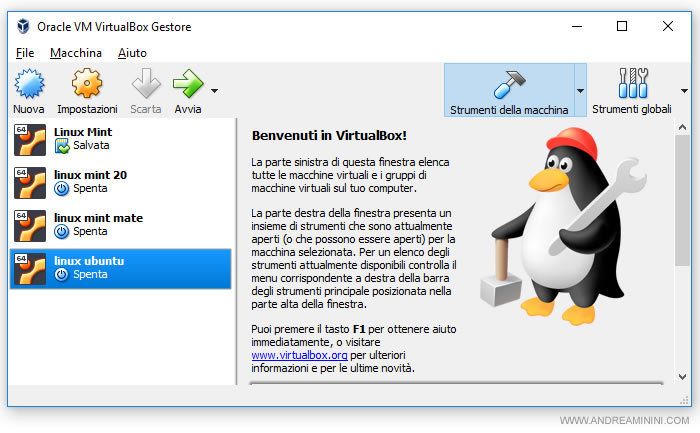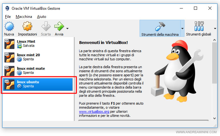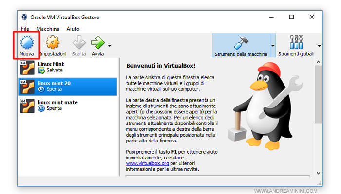 Per creare una nuova macchina virtuale clicco su Nuova.