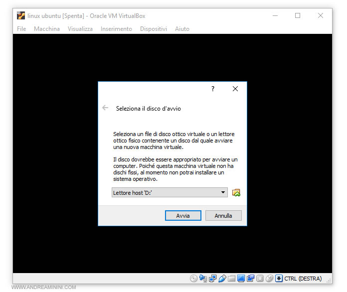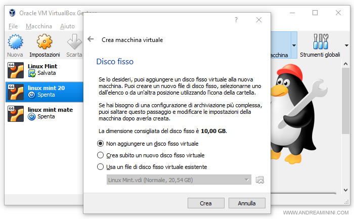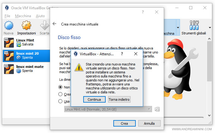Virtual Box mi avvisa che senza un disco virtuale non potrò installare un sistema operativo sulla macchina.