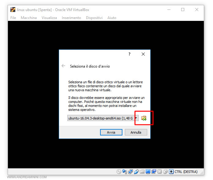 Clicco sull'icona gialla della cartella e seleziono il file ISO di Linux appena scaricato sul PC.