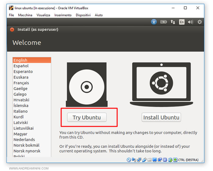 Alla prima schermata scelgo la lingua sul menu di sinistra e clicco su Try Ubuntu ( o Prova Ubuntu ).
